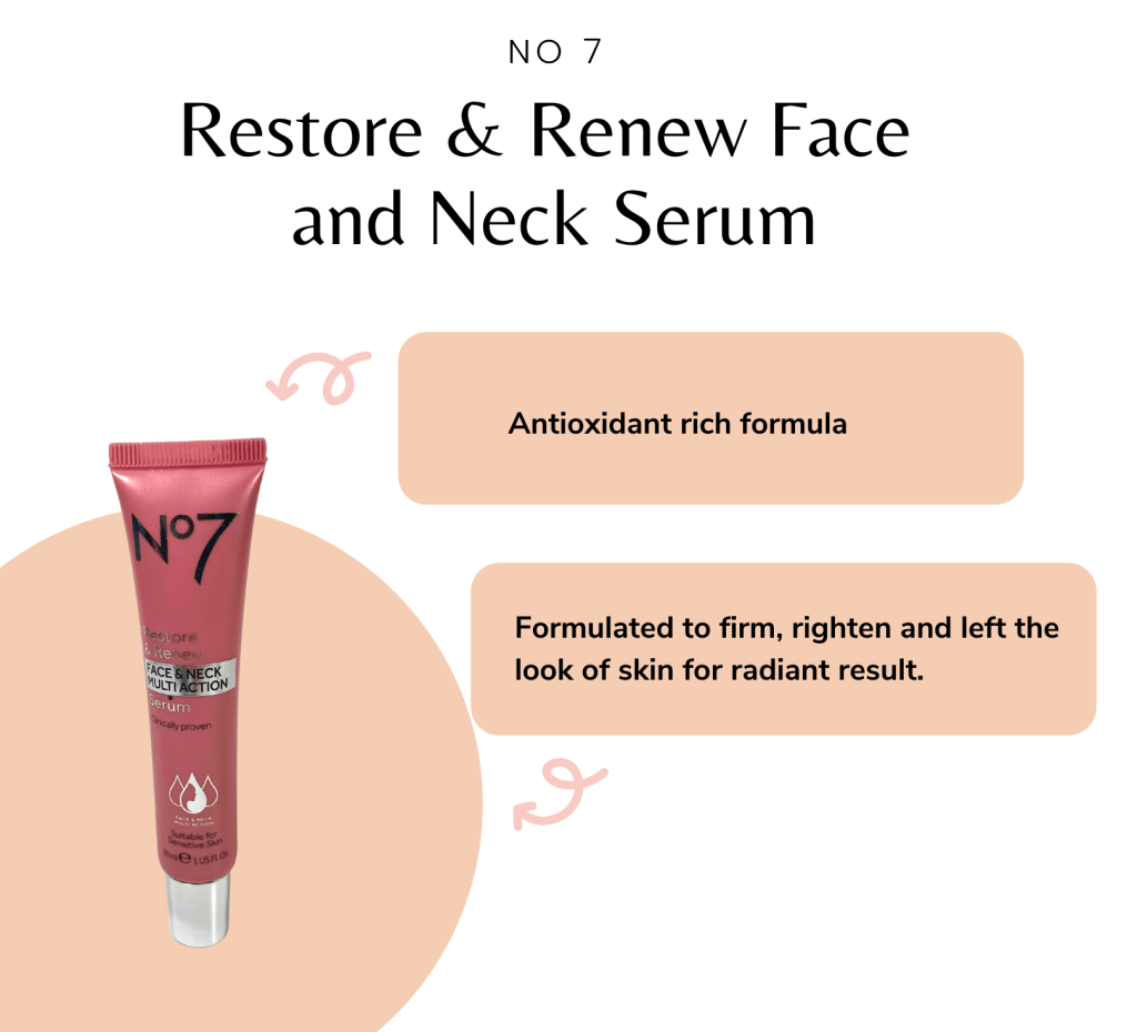 Besides cleansing your face this is probably the top product that I feel is a game-changer for me. No 7 Restore and Renew Face and Neck Serum. This serum is super lightweight and feels silky on the skin. When I apply this product I start at décolleté and work upward. When I reach my face area I don’t put it all over my face just in the “I need” areas. But I add a tiny bit on the pad of my ring finger and tap both ring fingers together and tap gently under my eyes. Remember your under-eye area is so delicate. So please be so gentle.