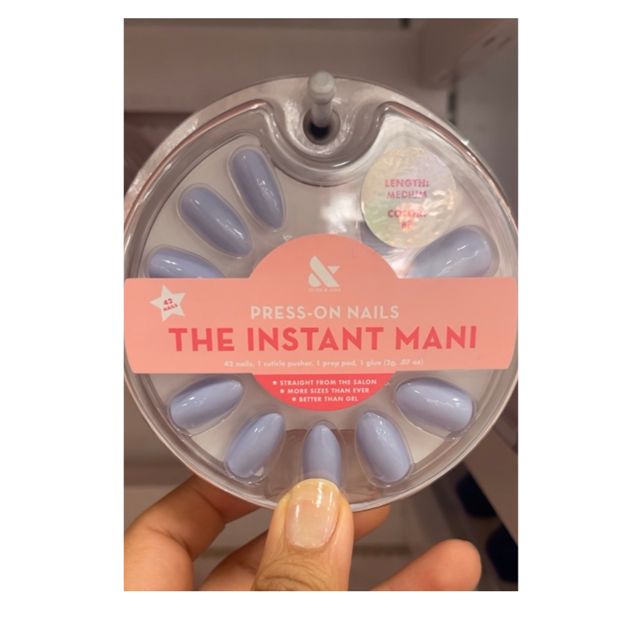 Olive and June Bp Olive and June made the list twice. And I saved the best color for last. Bp is my choice for the perfect blueberry milk look. Olive and June offers the shade in regular nail polish and this fun press on. The shade is creamy and a dusty blue making it prefect for this trend.